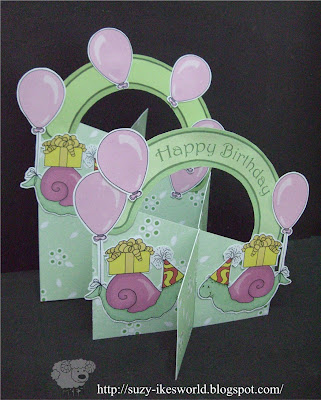 For my card, I decided to make a double zig-zag and I have used 'Party Snail' as my image from Whimsy. He is just soooo cute :-) I coloured him digitally and then cut him out several times, along with some extra balloons and stuck him on. The backing card is Green Eyelet from Seneca Pond Crafts.